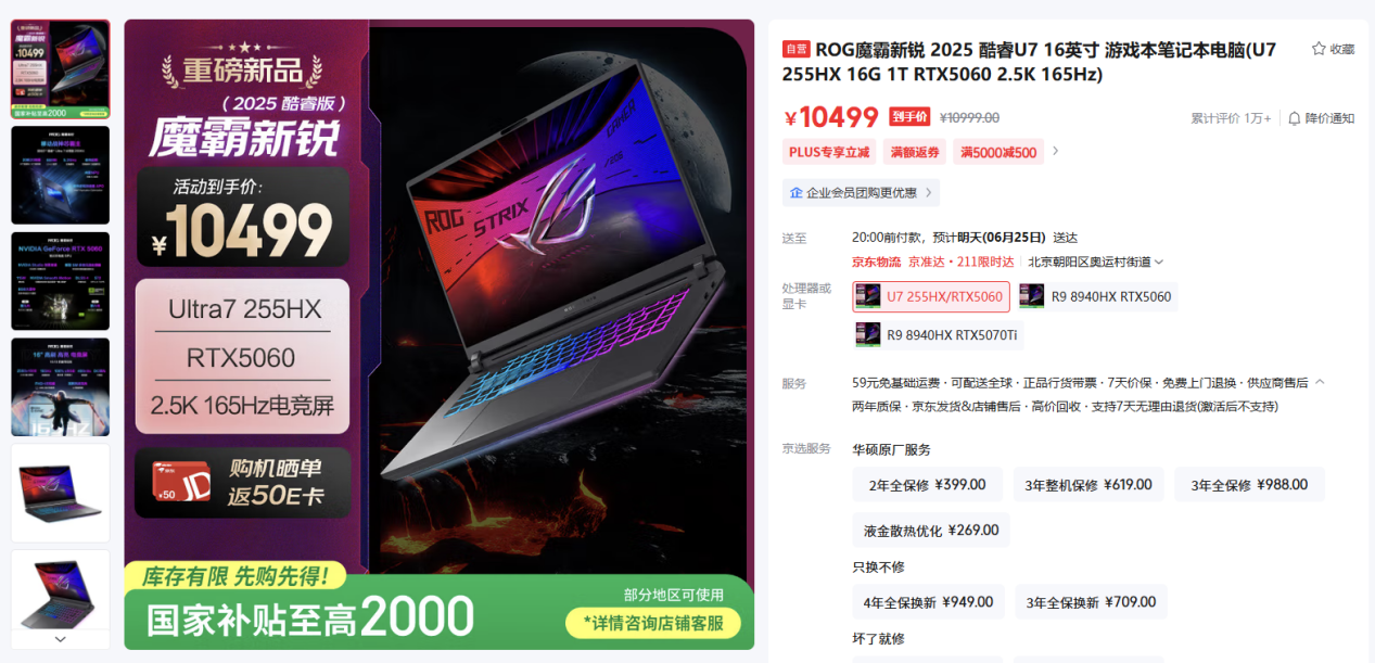 从京东商城的详情最终页了解到,目前两款极为超值的、搭载满血版RTX5060独显的高性能游戏本非常值得关注。一款是来自ROG旗下的魔霸新锐2025,其采用了英特尔U7-255HX处理器和NVIDIA GeForce RTX5060笔记本GPU,售价为10499元,国补至高补贴2000元,到手价仅为8499元,同时还享有晒单返50元E卡。破万元的价格,对于魔霸新锐2025来说,极为诱人。