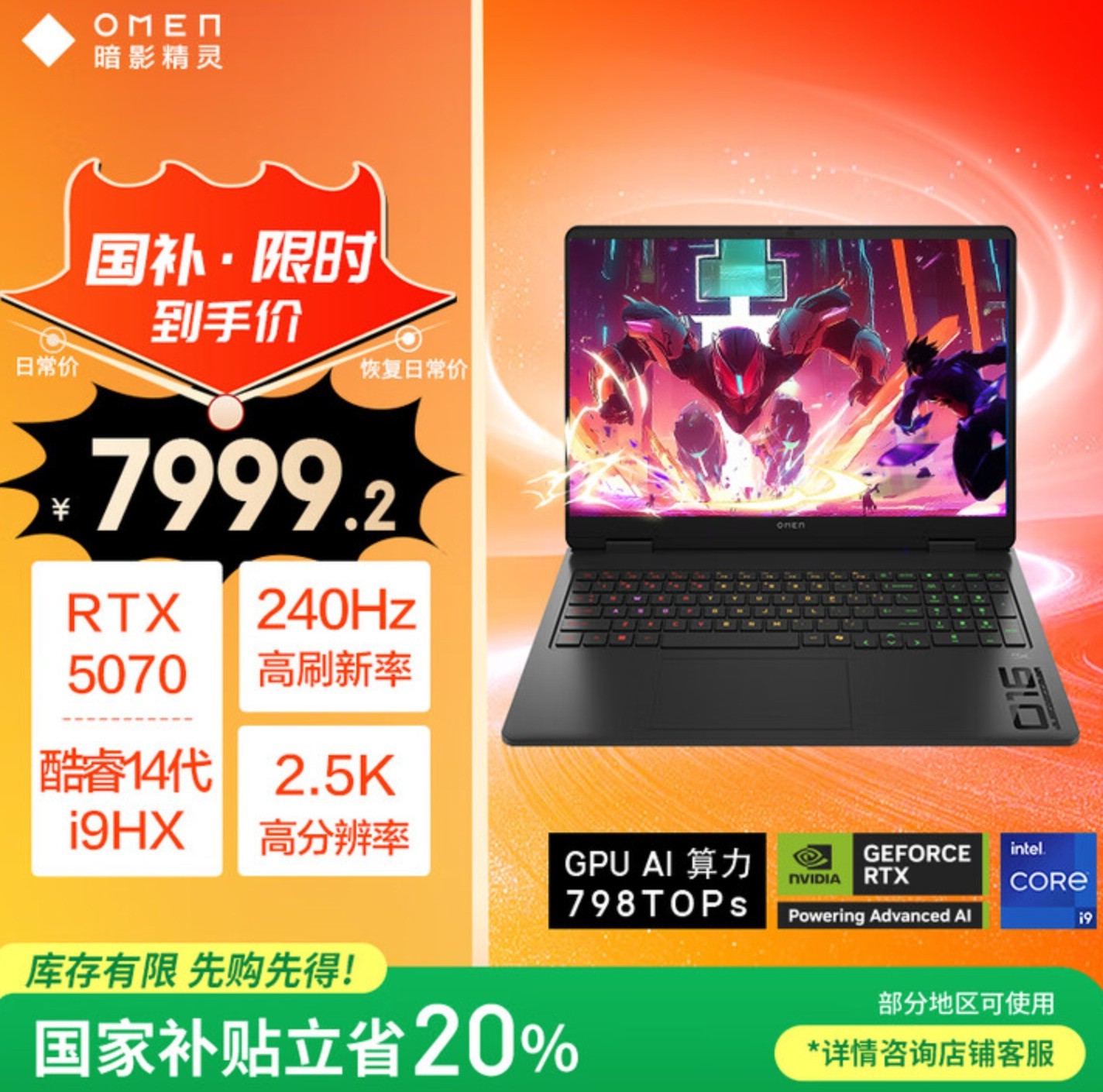 酷睿i9-14900HX RTX5070 32G 1TB,售价9999元,国补后7999.2元。