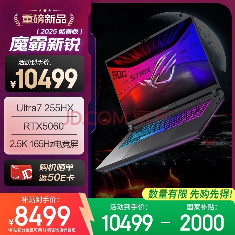 首先推荐的是ROG魔霸新锐2025,这款产品是一款面向准大学生群体的高性能游戏笔记本。目前,其市场定价为10499元,但部分地区经过国家补贴后,实际到手价为8499元,非常适合准大学生们现在选购。