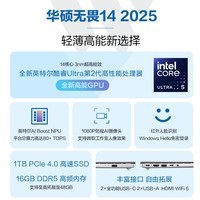 华硕ASUS无畏14 2025二代酷睿Ultra版14英寸轻薄本银色设计时尚轻盈,搭载最新酷睿Ultra处理器性能强劲功耗更低,带来持久流畅的使用体验14英寸高清屏幕色彩细腻办公学习娱乐都能轻松应对,金属机身质感出众,轻至约1.3kg,便于携带京东此款目前活动售价4799元,下单可领满4399减200元优惠券,叠加享受20%起减919.8元补贴优惠,最终实付低至3660.01元,性价比出众值得入手