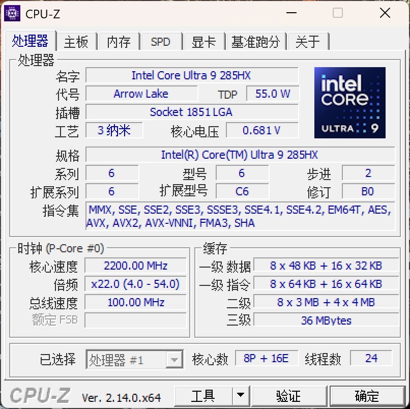 规格方面,英特尔酷睿Ultra 9 285HX拥有8个性能核和16个能效核,合计共24个核心。由于这一代并不支持超线程技术,所以其为24核心24线程。性能核的最大睿频为5.5GHz,能效核的最大睿频则能够达到4.6GHz,相比以往的能效核,英特尔酷睿Ultra 9 285HX的能效核在频率方面可以说很给力了。英特尔酷睿Ultra 9 285HX的缓存也给的挺多,二级高速缓存为40MB。英特尔酷睿Ultra 9 285HX的基础功耗为55W,最大睿频功耗能达到160W。