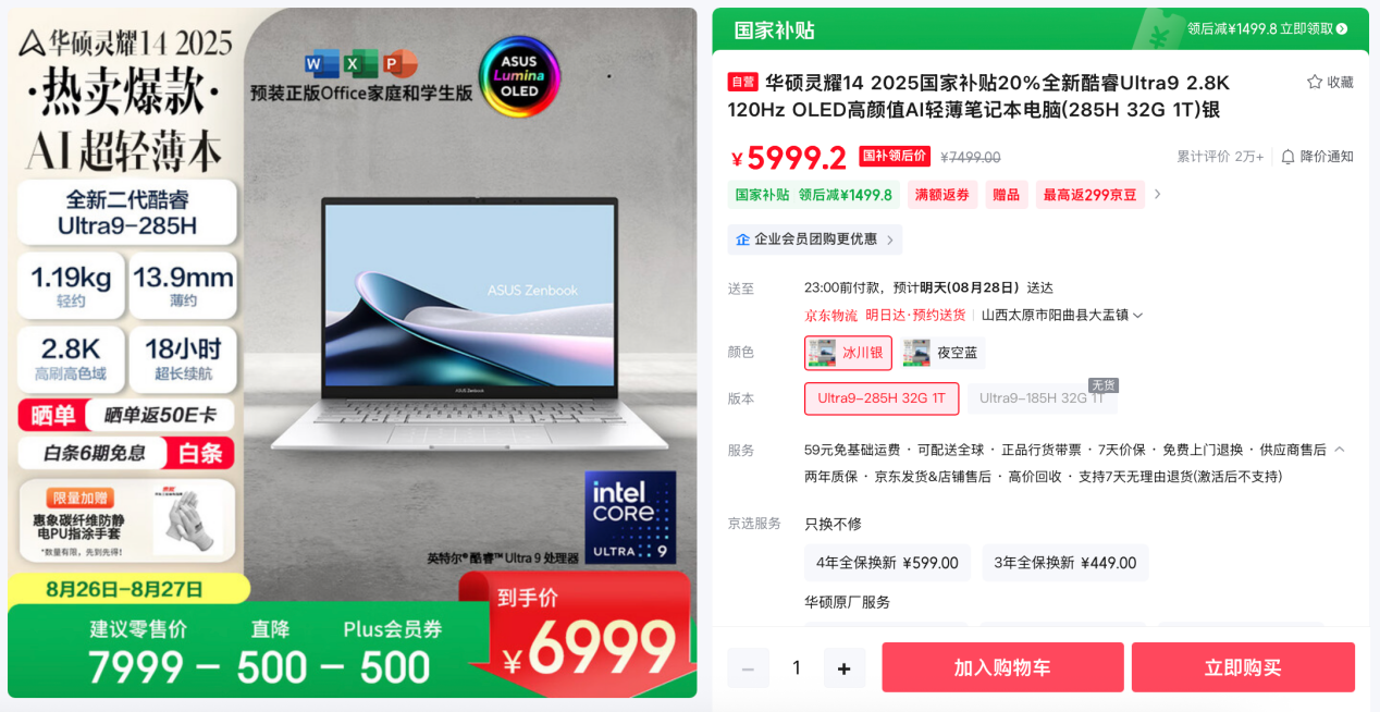 在忙碌的职场生活中,面对长时间会议讨论、紧迫的项目需求、无数的邮件信息,以及出差和外勤需求,一台轻便续航长又能高效处理工作的笔记本电脑,几乎成了每个职场人的刚需。华硕灵耀14 2025 AI超轻薄本正是为此而生,1.19kg极致轻薄便携机身带来强劲性能和至高18小时长效续航表现,完美契合现代职场的多变节奏,助你提升工作效率与生活质量。暑期购机直降500元,还可叠加500元PLUS会员券和至高20%国家补贴(购机活动详情还请咨询店内客服),到手5499.2元起。