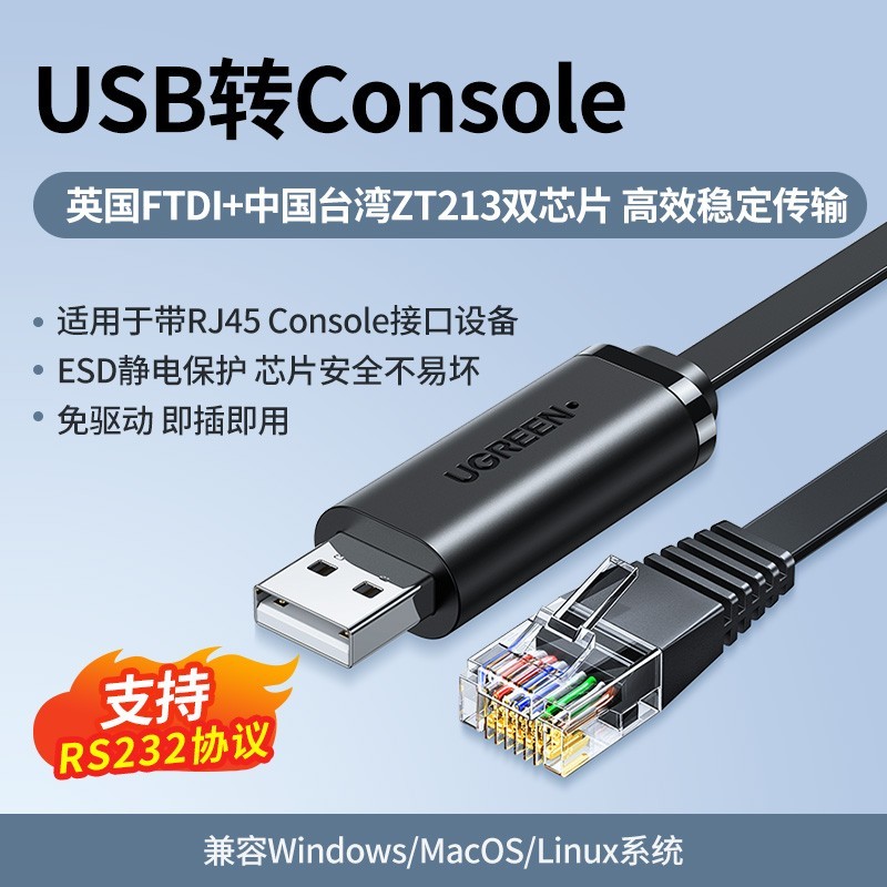 绿联USB转console调试线是一款专为笔记本电脑设计的多功能转换线,支持USB接口转RJ45串口网口,适用于交换机、路由器等网络设备的配置与调试,操作简单即插即用,无需安装驱动。采用高品质材料打造,传输稳定兼容性强,广泛用于网络管理与设备控制场景。
