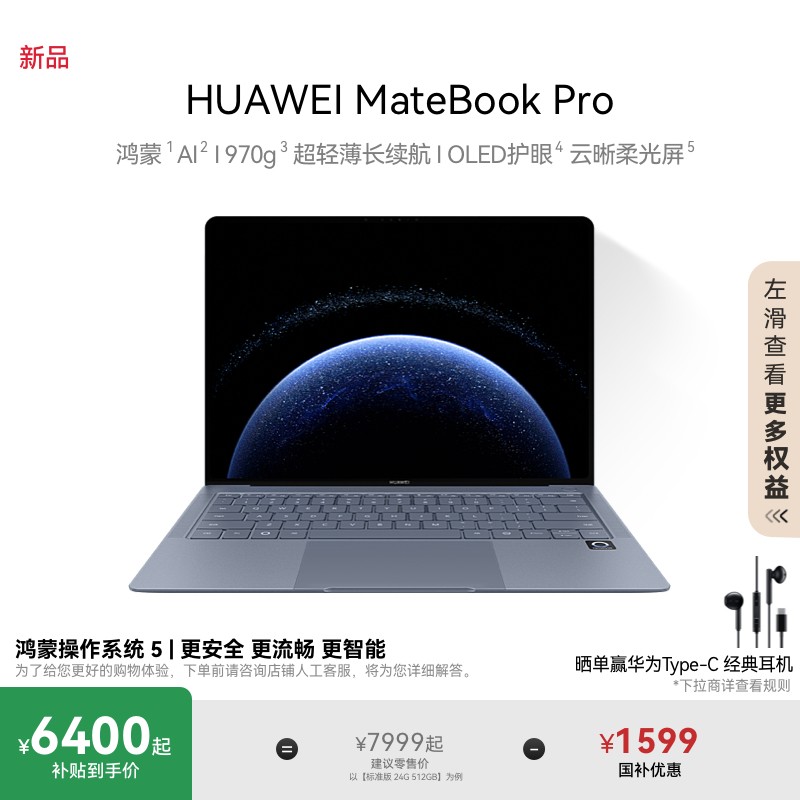 华为HUAWEI MateBook Pro笔记本电脑搭载鸿蒙操作系统,具备鸿蒙AI,拥有970g超轻薄的机身,长续航能力出色,还配备了OLED护眼云晰柔光屏。