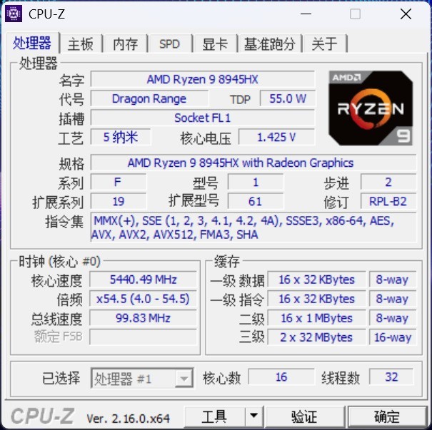先看一下锐龙9 8945HX的规格,锐龙9 8945HX虽然是上一代HX系列处理器,但核心规格还是很强悍的。它有着16核心32线程的规格,采用双CCD设计,放在最新一代处理器中,也是特别给力的。而且它的架构是Zen4,在性能方面与最新的Zen5并没有太明显的区别,所以整体性能并不弱。除此之外,它的基础频率为2.5GHz,最高加速频率为5.4GHz,L3缓存有64MB,TDP为55W,cTDP为55-75W。