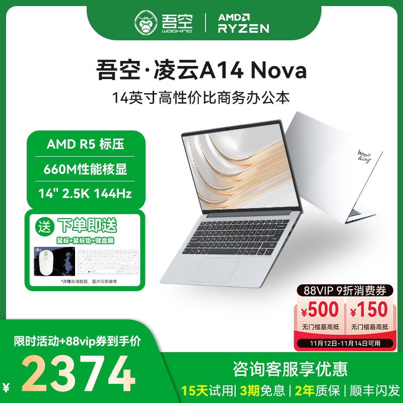 吾空 WOOKING 凌云A14轻薄本搭载AMD 锐龙 7 8745HS高性能处理器,拥有高色域护眼屏和长续航的特点。