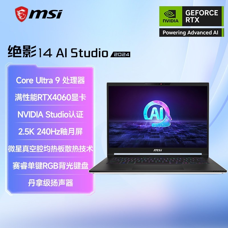 微星绝影14 Ai Studio酷睿U9笔记本电脑是一款集高性能与便携设计于一体的14英寸轻薄全能游戏本,搭载强劲的酷睿U9处理器和RTX4060独立显卡,轻松应对游戏娱乐、内容创作与多任务处理需求。配备2.5K高分辨率屏幕,带来清晰细腻的视觉体验,色彩还原精准,画面表现力出众。机身设计轻薄便携,适合移动办公与日常使用,同时散热高效,保障长时间稳定运行。