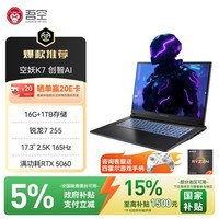 吾空空妖K7笔记本电脑搭载AMD锐龙R7-255处理器,配备16GB内存和1TB大容量固态硬盘,运行流畅响应迅速,无论是多任务处理还是大型软件运行都能轻松应对。17.3英寸2.5K高清大屏带来细腻画质表现,支持高刷新率,画面顺滑无拖影,搭配高性能独显RTX5060,图形处理能力强劲,畅玩主流3A游戏,高效支持设计剪辑等专业创作需求。目前京东售价7777元,参与Plus会员立减及国家补贴优惠活动,下单实付仅需6577.41元,性价比突出,是游戏发烧友和创意工作者的理想之选。