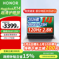 荣耀笔记本电脑 X14 2025 酷睿13代i7标压高性能AI商务办公轻薄本家用游戏学生手提电脑金属2.8K高刷屏 【新品】Ultra5-125H/24G/1T/2.8K 官方标配