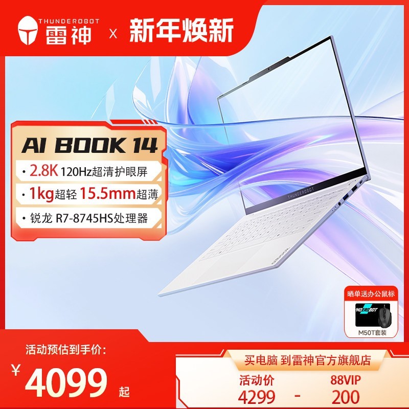 想拥有一款性能出色的便携式轻薄本?雷神 AiBook14Air 能满足你。它搭载锐龙 R7 - 8745HS 处理器,屏幕达到 2.8K 高清,方便携带又不失轻薄属性。