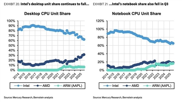 在桌面电脑领域,苹果同样实现稳步增长,目前市场占有率达到约10%。从整体格局看,在Intel份额被逐步蚕食的过程中,AMD成为主要受益者,反映出用户在x86架构桌面平台中对AMD产品的偏好正不断增强。