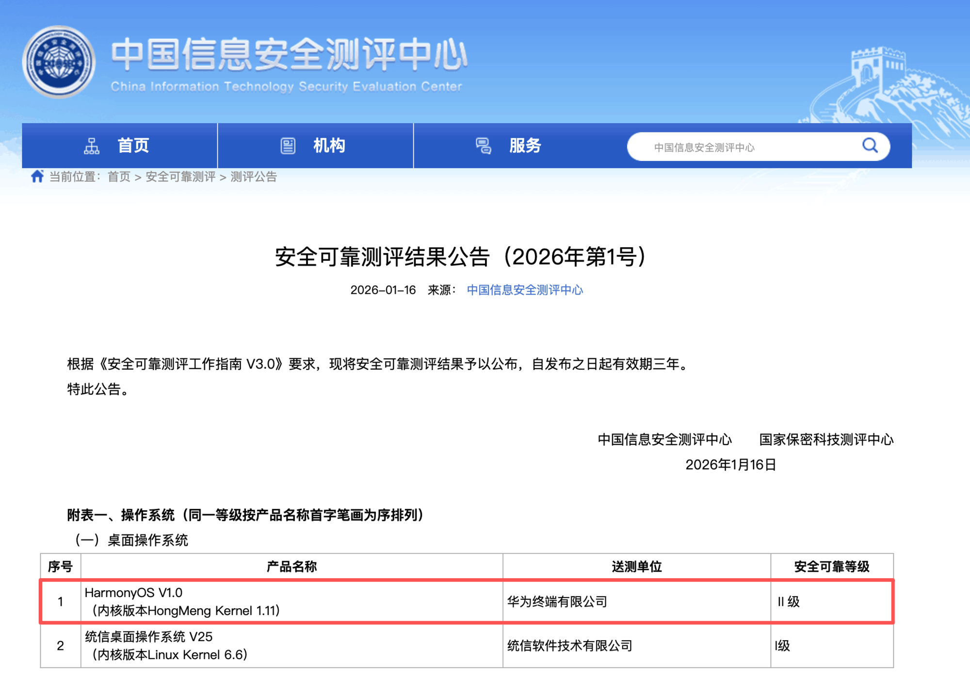 【ZOL中关村在线原创新闻】2026年1月16日,中国信息安全测评中心发布了《安全可靠测评结果公告(2026年第1号)》,释放出一则重磅消息:鸿蒙桌面操作系统(HarmonyOS V1.0)通过最高安全可靠等级Ⅱ级评测认证,成为首个达到该等级的国产桌面OS!这一历史性时刻既是HarmonyOS在安全性与可靠性的硬核背书,更是国产操作系统从"跟跑"向"领跑"跨越的重要里程碑。