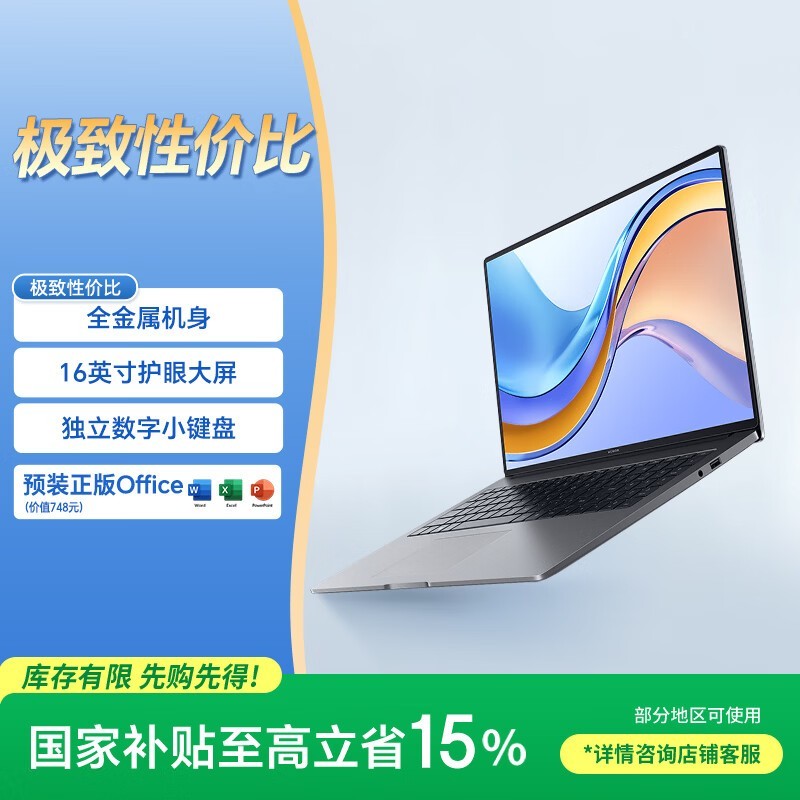 荣耀笔记本 X16 战斗版(i5 12450H/16GB/512GB)到手价仅3099元,是一款兼具质感与实力的主力机型。其采用金属机身设计,重量控制在1.68kg,厚度17.9mm,便于携带又不失稳固感。搭载第12代酷睿i5处理器,配合16GB内存和512GB PCIe 4.0高速固态硬盘,无论是运行Python脚本、处理大型Excel数据表,还是同时开启多个PDF文献窗口,都能保持流畅响应。16英寸1920×1200分辨率IPS雾面屏有效减少反光干扰,300尼特亮度和莱茵低蓝光认证,在长时间阅读或夜间写作时显著缓解视觉疲劳。支持多设备协同功能,可与手机无缝传输资料,提升跨终端工作效率。