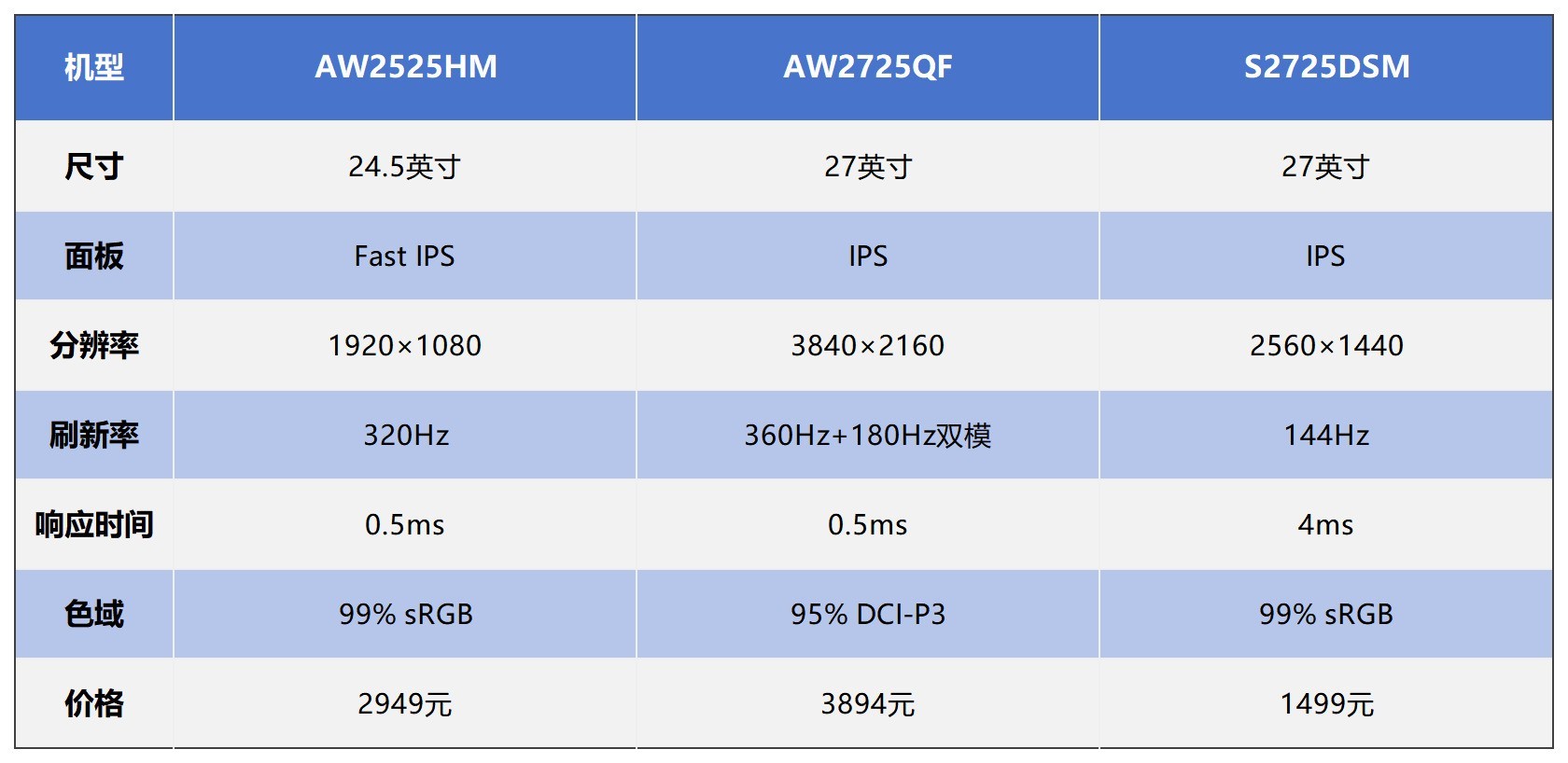 三款产品分别为ALIENWARE AW2525HM、AW2725QF以及戴尔S2725SM,具体配置如下: