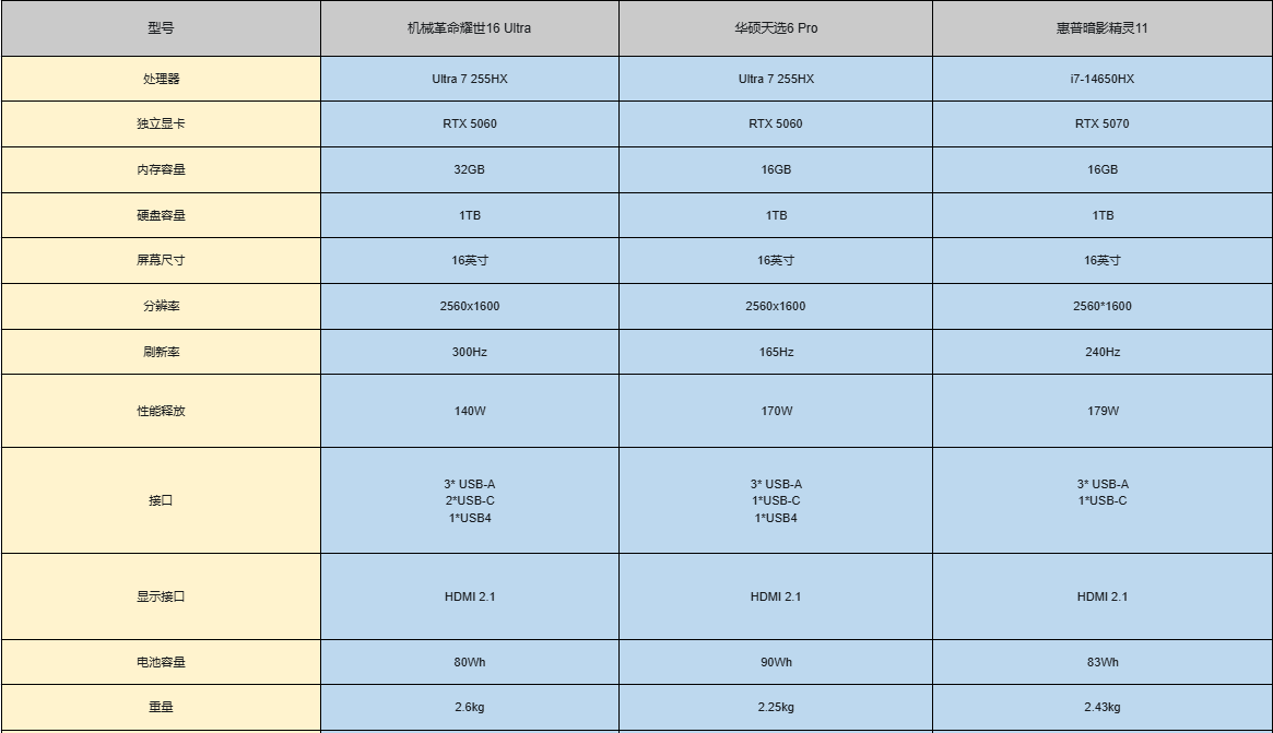 这三款产品分别是机械革命 耀世16 Ultra、华硕天选6 Pro以及暗影精灵11,以下是这三款主板的对比参数。