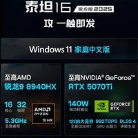 微星泰坦16游戏本笔记本电脑,搭载全新HX处理器酷睿,性能强劲。拥有高刷屏,能带来流畅的视觉体验。具体配置上采用R9 - 8940HX处理器,搭配5070Ti显卡,还有32G内存与1TB固态,无论是玩大型游戏,还是进行多任务处理等都能轻松应对。