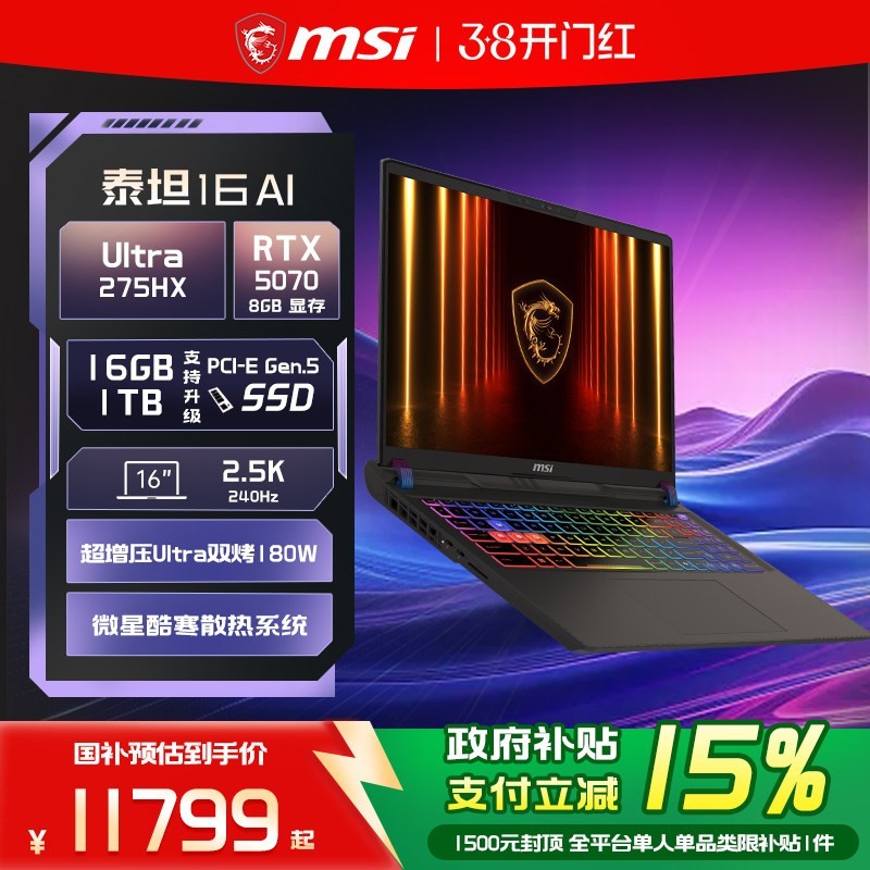微星泰坦16 AI旗舰电竞本搭载全新U9 275HX高性能处理器与满血版RTX 5070Ti独立显卡,配备2.5K分辨率、240Hz高刷的16英寸窄边框电竞屏,散热强劲性能释放从容,AI加速创作与游戏体验双升级,现天猫官方旗舰店限时大促,参与满9999减2000元活动,原价15299元直降至13299元...
