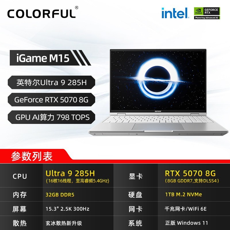 七彩虹iGame Origo M15全能轻薄AI游戏笔记本电脑,搭载全新Intel Ultra 9 285H处理器与NVIDIA GeForce RTX 5070独立显卡,配备15.3英寸高刷屏,支持AI智能加速与高性能创作游戏双模优化,轻薄机身兼顾强悍性能与便携体验。