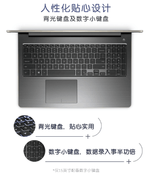 键盘带背光,晚上不用开灯也能看清,加班不影响家人休息。15.6英寸型号的产品还带数字小键盘,数据录入事半功倍,上网输入各种登录密码,都依赖小键盘,玩游戏更方便。