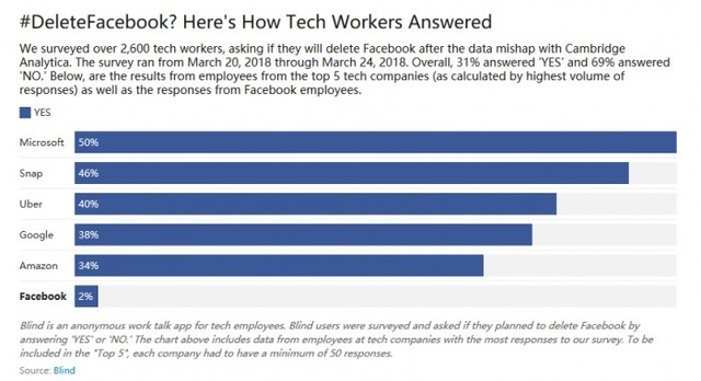 美国方面一项调查显示,超过2600名来自微软、Snapchat、Uber、Google 、亚马逊的IT从业者表示将删除自己在Facebook上的账号。