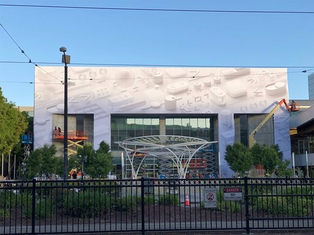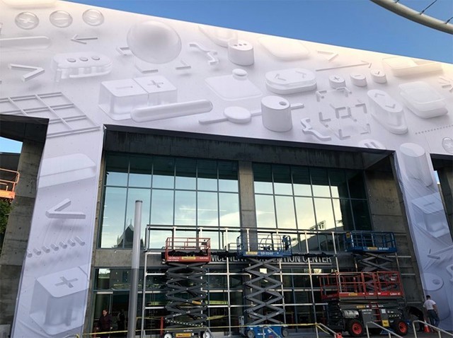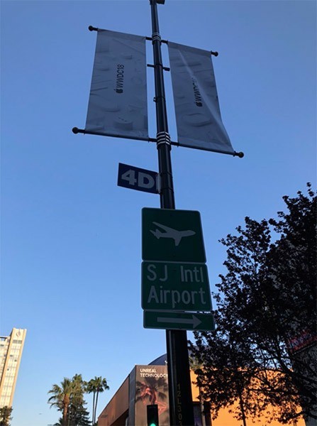 今年 WWDC 也在加利福尼亚州圣何塞McEnery会议中心举行,可以看到会场外围的装饰与苹果 WWDC 邀请函一样的设计,该设计以浮动在白色背板上方的一系列三维图形用户界面元素为特色,突出了 WWDC 以软件为主的基调,并且今年会有众多围绕用户体验和交互上的更新。