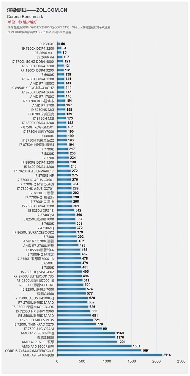 其二:在满载时间较长的多线程性能测试中,锐龙5\7(Pro) 四款处理器整体表现不如预期。以Corona Benchmark为例,Intel 最强的8代酷睿低电压处理器已经接近i7 7700HQ 四核标压处理器或桌面i5 7600K 四核处理器,但移动锐龙军团整体耗费的时间都要更久,性能最强的宏碁、惠普同Intel 8代酷睿较弱的那一批差不多,下等马联想ideapad 720S甚至可同自家双核i5 7200U一同竞速。