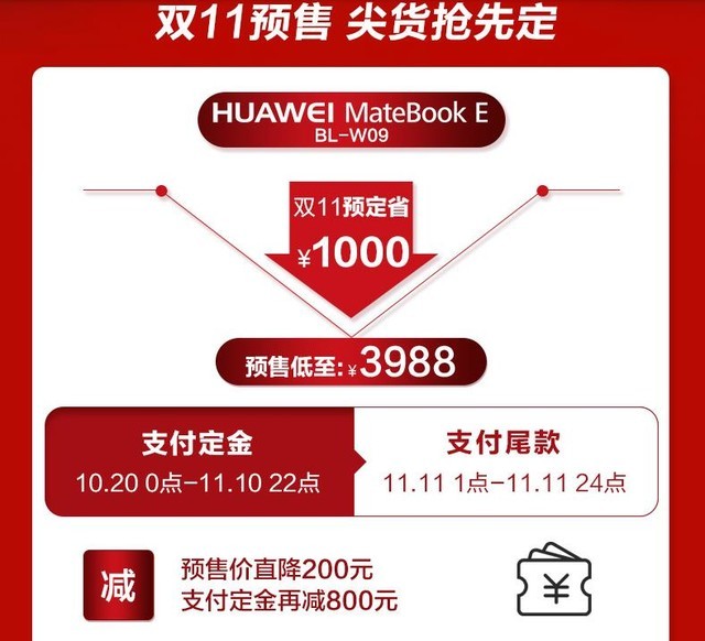 双十一就要到了,很多厂商都做好了准备,从现在开始就进行了预售活动,优惠幅度非常大,华为MateBook E BL-W09就是如此,这是一款二合一轻薄商务本,非常适合办公使用,双11之前接受预定,预售价直降200元,支付定金后再减800元,到手价只需3988元,优惠幅度相当大,还有支付尾款赠送内胆包和鼠标的活动,快来抢购吧。