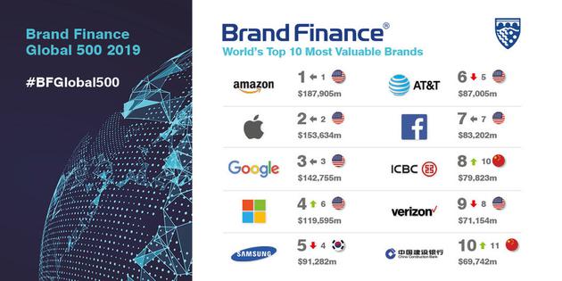 全球品牌500强 亚马逊蝉联榜首 华为第12
