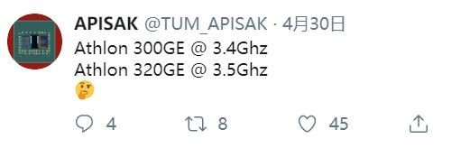 从@TUM_APISAK发出的推特来看,速龙300GE、320GE的频率很可能达到3.4GHz和3.5GHz,比现在的速龙200GE和220GE分别提高了200MHz和100MHz。