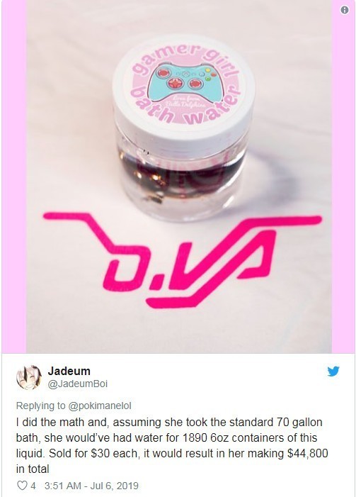 不过近日有媒体报道称,Twitch平台英国美女主播Belle Delphine在Ins上卖起了自己的洗澡水,一瓶30美元,推特有网友猜测其通过贩卖自己的洗澡水,已经赚了至少4万多美元。