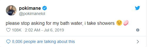 虽然这是女主播的个人选择和个人行为,但是受此影响,不少粉丝想要女主播私人物品的欲望也被勾了起来。比如Twitch女主播“Pokimane”就因为其粉丝向其提出类似要求而不胜其烦,最终通过社交媒体对Belle Delphine的行为表示了强烈的不满。Pokimane在推特上无奈地表示:“我洗澡不用澡盆,用的是喷头”,但仍有一些粉丝在评论中表示:希望Pokimane能出售漱口水、头发等物件。