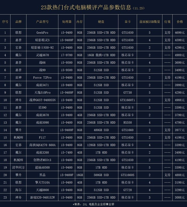 最终我们选择了23款台式电脑参与横评,产品详细信息如下: