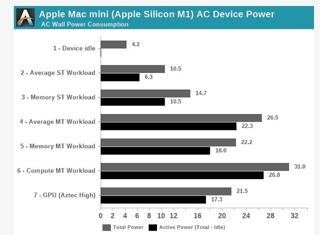 今日,外媒 AnandTech 对新款 Mac mini 进行了功耗测试,空载时整机约为 4 W,满载 31W。请注意这里需要强调的是以上测试的数值为整机功耗,也就是安装了内存、硬盘、键盘、鼠标、显示器等各种配件后的功耗表现,可见M1的能耗比多么惊人。