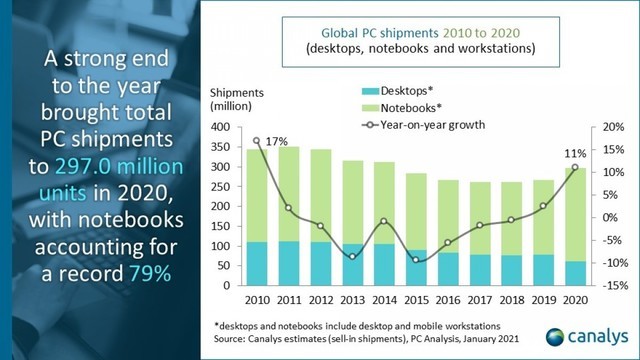 国际市场研究机构 Canalys 给出了略有不同的数据,表示 2020 年的笔记本电脑出货量达2.351亿台,台式电脑出货6190万台。
