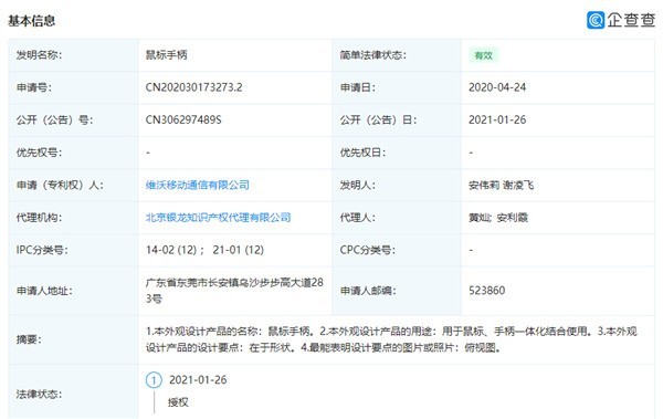 最近,vivo关联公司维沃移动通信有限公司公开一种“鼠标手柄”外观设计专利,公开号为CN306297489S。