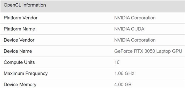 这个曝光来自GeekBench 5,明确给出了GeForce RTX 3050 Laptop GPU的具体型号,规格是16个计算单元,也就是2048个流处理器,搭配4GB显存,应该是128-bit GDDR6。