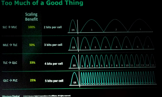 这一信息是在美银美林2021年全球技术大会上披露的,西部数据的技术和战略主管SivaSivaram说,"我预计[从QLC到PLC]的过渡会比较慢。因此,也许在这个十年的后半期,我们将看到一些细分市场开始获得每单元5比特"。