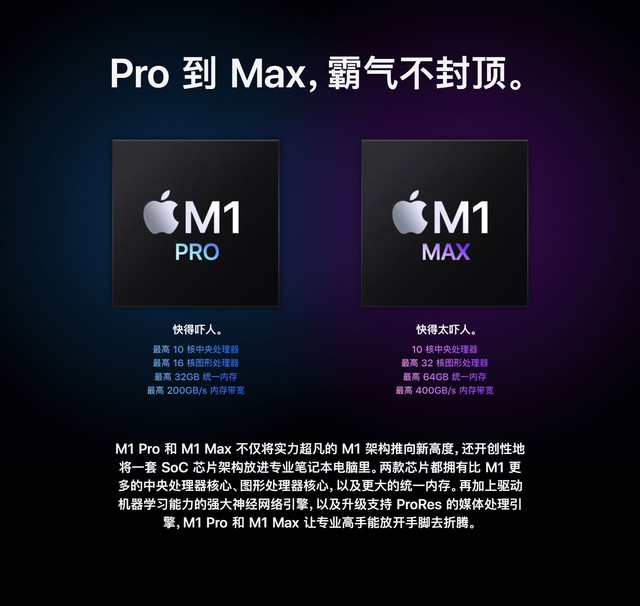 在发布会中,苹果新品M1 Pro和M1 Max的性能就令人印象深刻,这次苹果共提供了五种芯片规格: