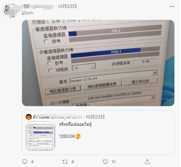 知名数码博主推特曝光了英特尔12代酷睿i5-12600K处理器的CPU-Z测试结果截图,结果显示这款处理器性能相当惊人。
