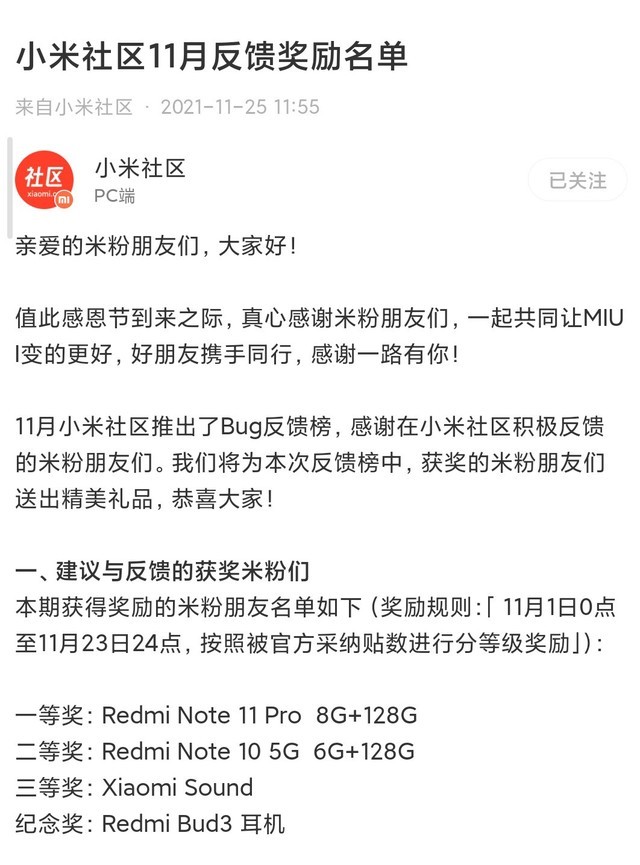 本文属于原创文章,如若转载,请注明来源:小米开窍了!推出BUG反馈奖励榜 一等奖为Redmi Note 11 Prohttps://nb.zol.com.cn/781/7817733.html