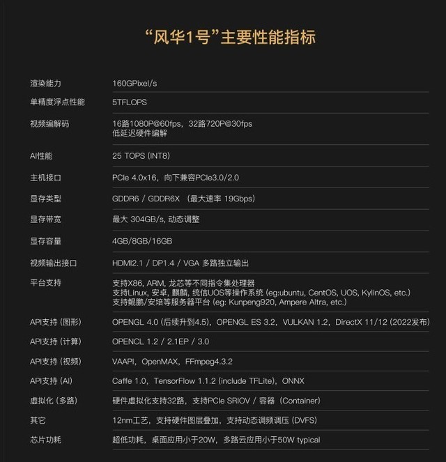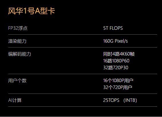 从官方给出的数据来看,风华1号A型卡FP32浮点性能5T FLOPS、渲染能力160G Pixel/s、AI计算为25TOPS(INT8)、编解码能力:同时4路 4K60帧,16路1080P60,32路720P30。
