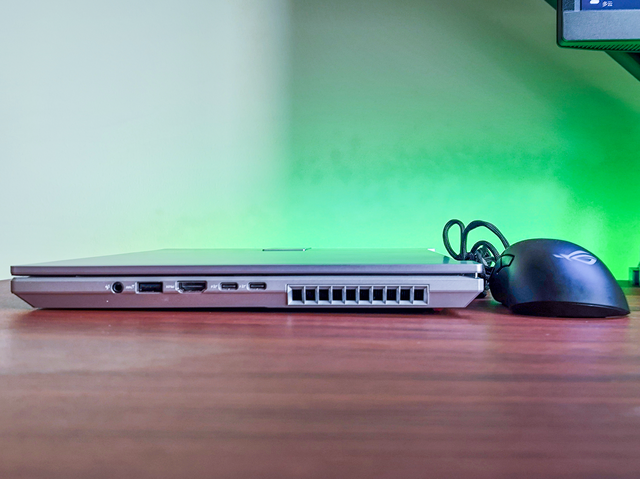 机身厚度为19.9mm,对比月刃鼠标比较明显,作为全能本虽然比传统轻薄本要厚一些,但对比传统游戏本和工作站可就薄很多了,几乎占一半面积的出风栅看着就很安心。