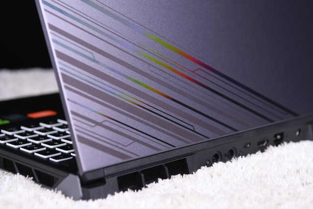 旷世16 Super游戏本在A面还采用了颇具硬核科技感的斜切纹理作为点缀,通过先进的工艺线条能够在不同角度展现出变幻莫测的炫彩效果。