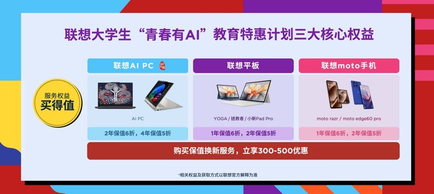 此外,联想还为大学生们定制“保值换新”服务,购买联想AIPC可享受2年保值6折、4年保值5折。购买保值换新服务,高校学子们还可立享300-500元优惠,如拯救者笔记本电脑换新服务学生专属价直降400元,仅需399元。