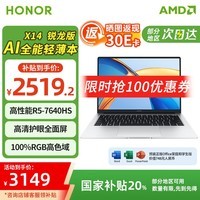 荣耀(HONOR)X14锐龙版 【国家补贴20%】AI高性能笔记本电脑(R5-7640HS 16G 512G 护眼屏) 14英寸 100%RGB 正版Windows+office